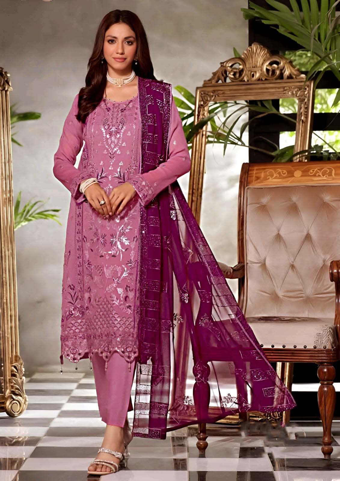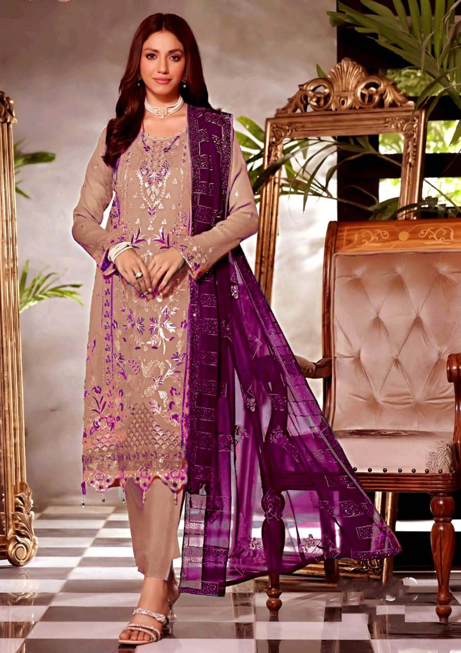 This outfit blends modern sophistication with traditional craftsmanship. The combination of beige and purple is eye-catching yet graceful — ideal for women who appreciate refined fashion with a hint of boldness.