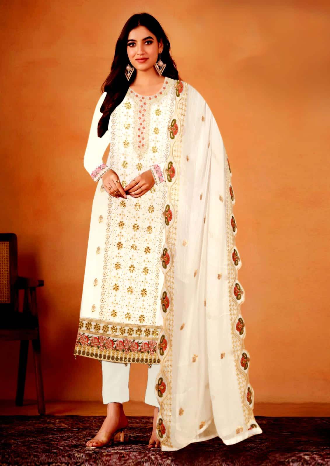 Fabric: White gold, providing a graceful drape and subtle sheen, making it ideal for festive wear.