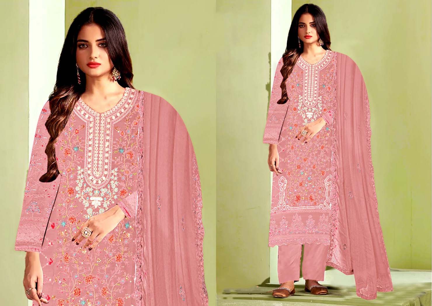 This outfit is a pastel pink traditional embroidered salwar kameez that exudes elegance and soft femininity ideal for daytime festive or semi-formal occasions.