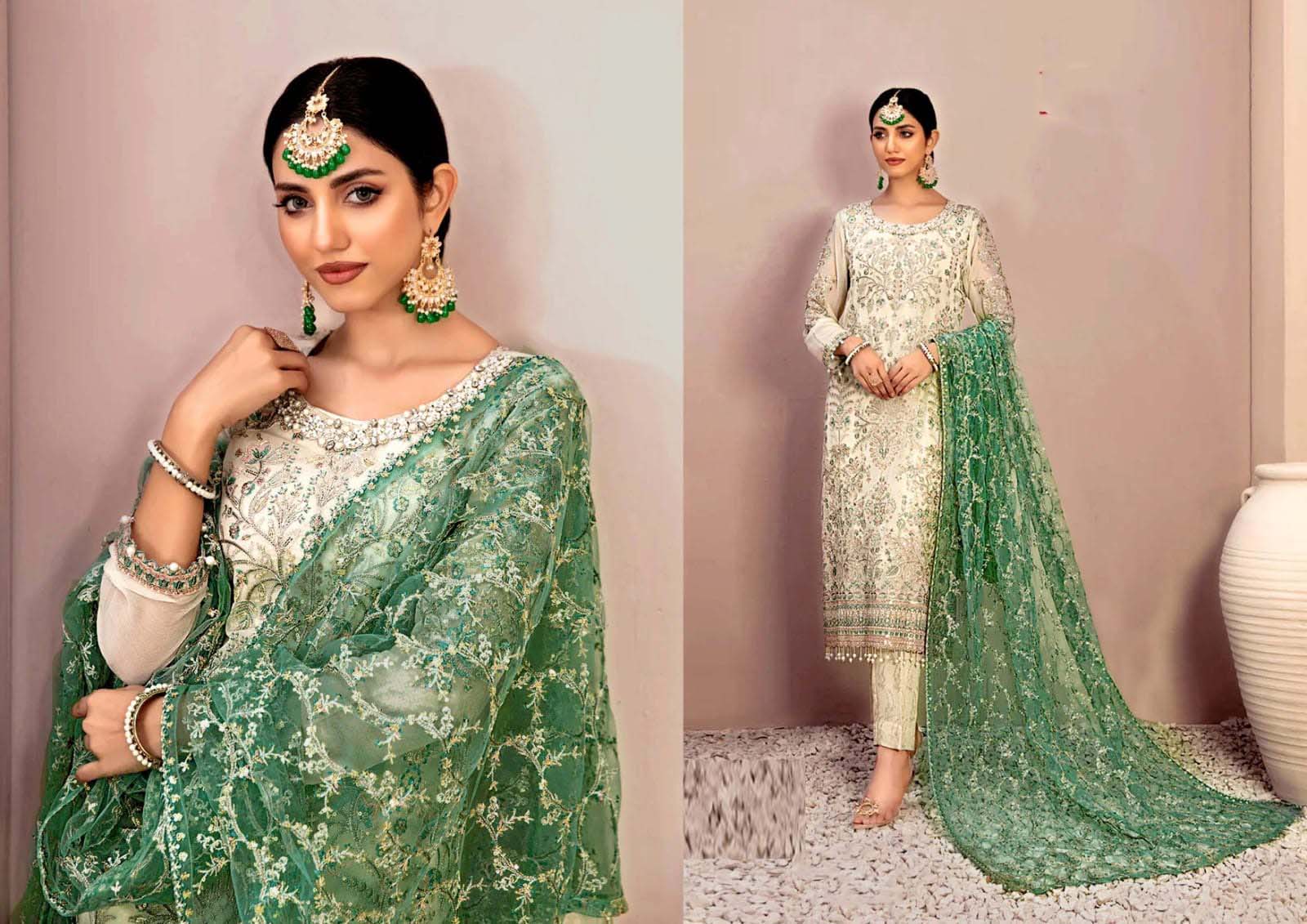 This ensemble perfectly blends subtle grace with celebratory vibrance. The combination of a neutral base and a golden-yellow dupatta makes it ideal for festive events or wedding guest attire. It’s timeless, regal, and effortlessly elegant.