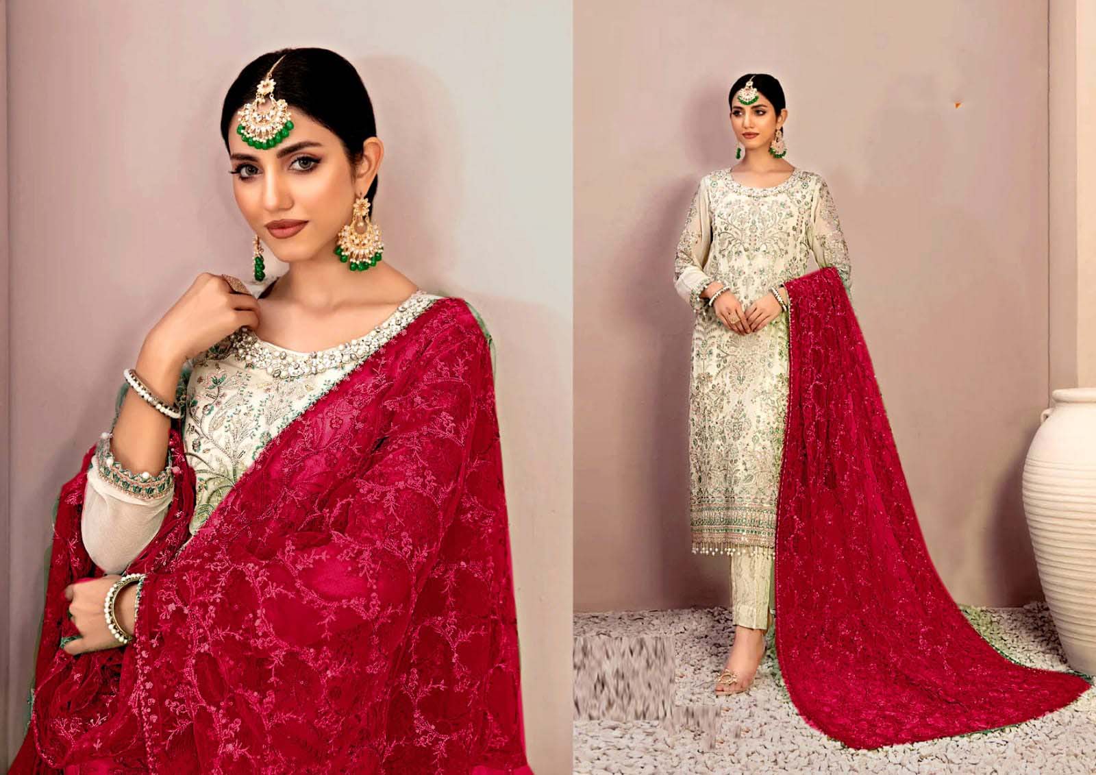 This ensemble perfectly blends subtle grace with celebratory vibrance. The combination of a neutral base and a golden-yellow dupatta makes it ideal for festive events or wedding guest attire. It’s timeless, regal, and effortlessly elegant.